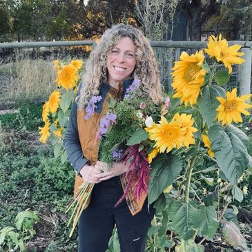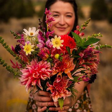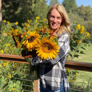 Tumalo Flower Farm began through my love of tending flowers inherited by my mother. Our 5-acre property (a former horse rescue) is nestled in beautiful Tumalo. In the spring of 2023, I used the plentiful horse manure left by the former property occupants to build the first 10 rows and started growing cut flowers in a former pig pen which was the beginning of Tumalo Flower Farm. Our plans for Tumalo Flower Farm, include a greenhouse for seed starting and to establish a large plot that was formerly rough trodden by horses into an abundance of flower rows. Our farm is pollinator friendly, and we use the no till method whenever possible to build up our Central Oregon soil. I hope my flowers showcase the true passion and excitement I have for them and as always encourage all to Buy Local Flowers. In my free time, I love spending time with my family, enjoying our pups and tending to our chickens.